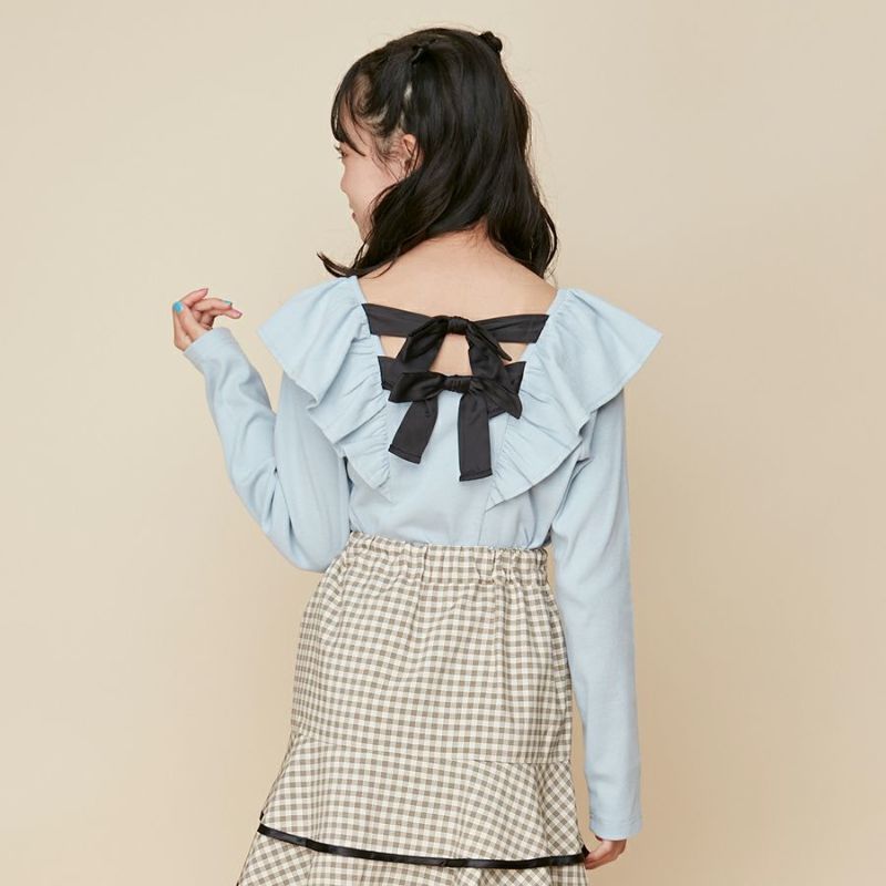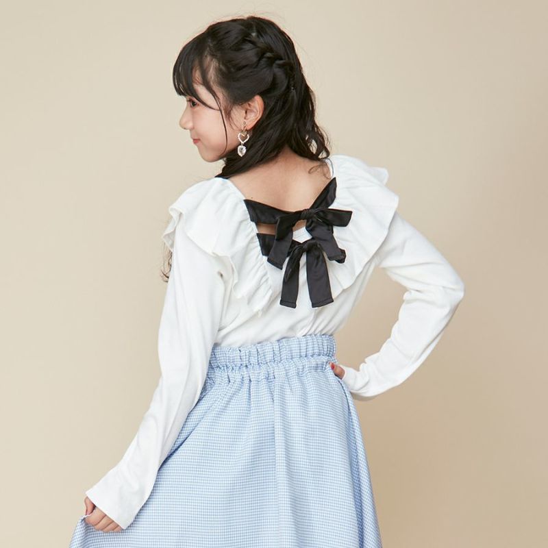 フロントはスクエアネックと肩のフリルが可愛い大人っぽデザイン、バックは2段になったリボンが存在感バツグンなガーリーデザインに♪