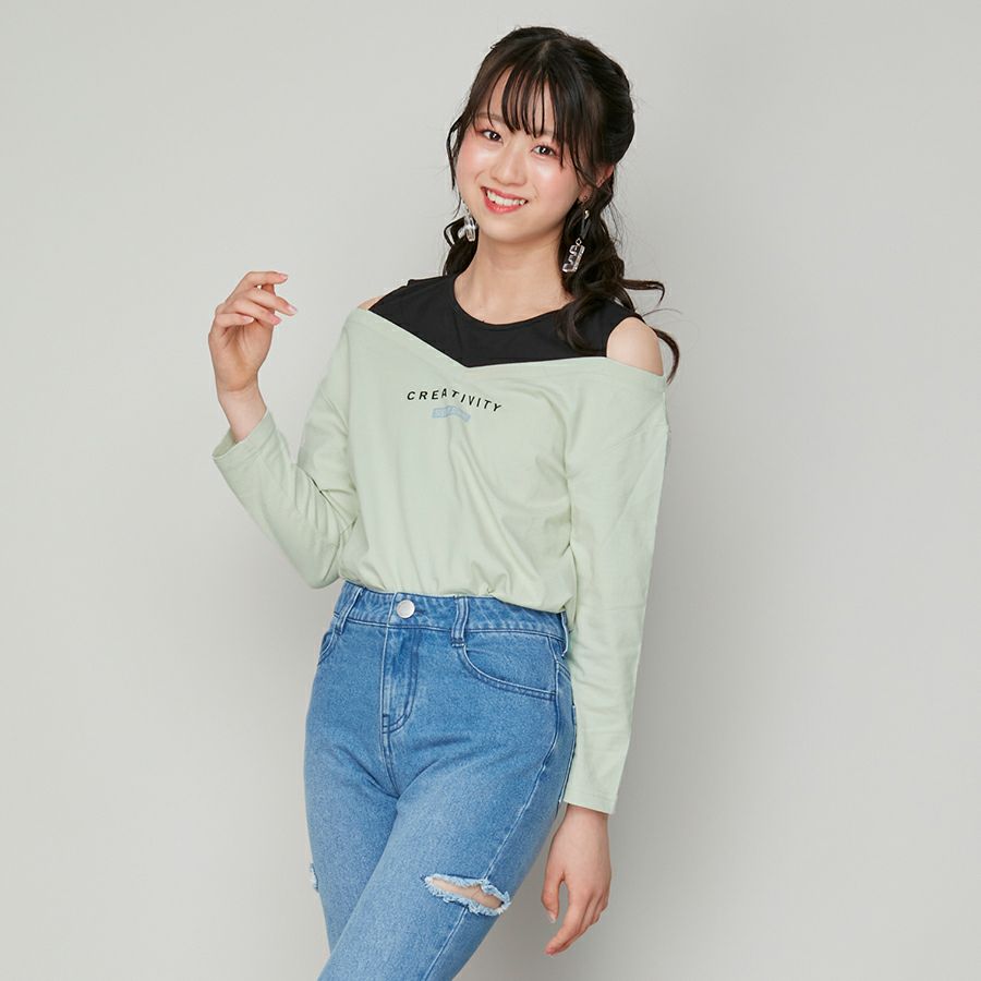 【75%off】レイヤード風肩あきロンT