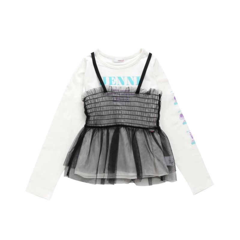 シンプルなロンTも、チュールキャミを合わせると一気にオシャレコーデに。