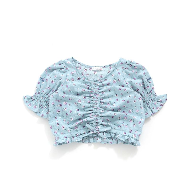 小さな花柄が散りばめられた鮮やかなブラウスは