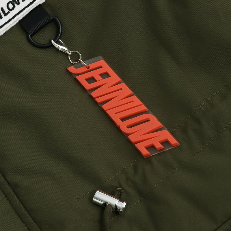 左胸に付いた刺繍ワッペンと立体ロゴのシリコンチャームが